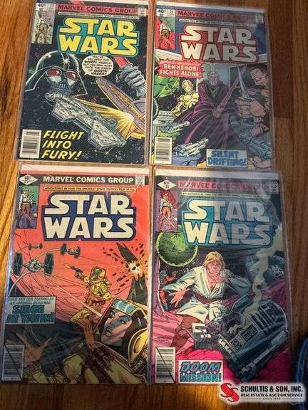 Four Star Wars Marvel comics, issues #23-26. Includes titles such as 'Siege at Yavin' and 'Flight into Fury'. Bagged and boarded, condition unverified.