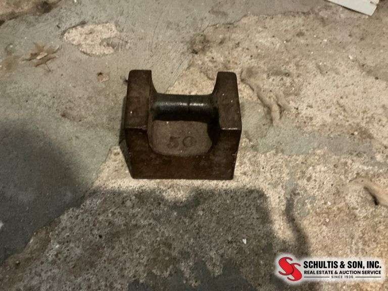 Rectangular cast iron 50-lb weight featuring an integrated handle. The weight is marked '50' on its top surface. Displays wear and rust consistent with use.