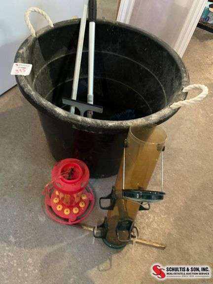 Includes a black plastic tub, a telescopic squeegee, floor mop, tube-style bird feeder, and red hummingbird feeder. Visible wear on items.