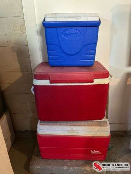 Three hard-sided coolers, brands include Coleman and Igloo. Various sizes, red and blue colors. Visible wear from use.