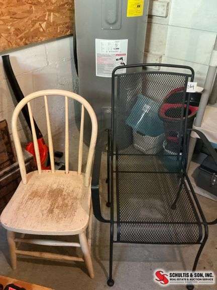 Includes one painted wood chair with spindle backrest showing surface wear and one black metal mesh patio chair with armrests. Both show wear typical of use.