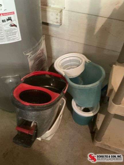 Three cleaning buckets, including one with integrated wringer and one rectangular bucket. Used condition visible.