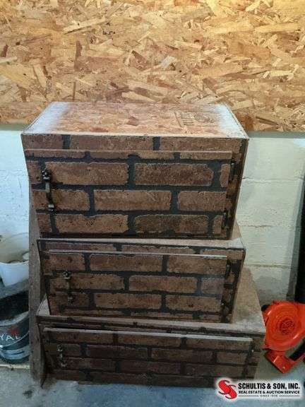 Three handcrafted wooden storage units with brick-patterned exterior. Features hinged doors and inner compartments. Made from particleboard/plywood. Shows wear consistent with use.