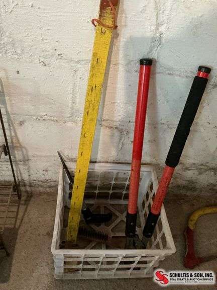 Tools including bolt cutters with red handles, a yellow measuring device, and hand brushes. Visible wear from use.