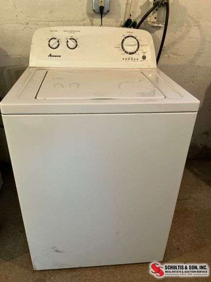 Amana top-load washing machine featuring load size and wash temperature controls. Includes normal, delicate, and casual cycles. Some wear consistent with use.