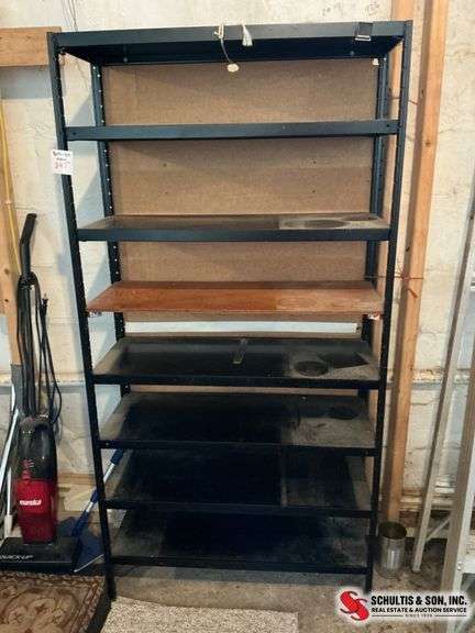 Tall shelving unit with a black metal frame and six adjustable shelves, including one in wood veneer. Shows wear consistent with use.