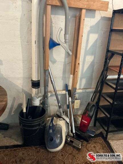 Includes a canister vacuum, upright vacuum, cleaning attachments, hoses, and PVC pipe sections. Items show signs of wear.