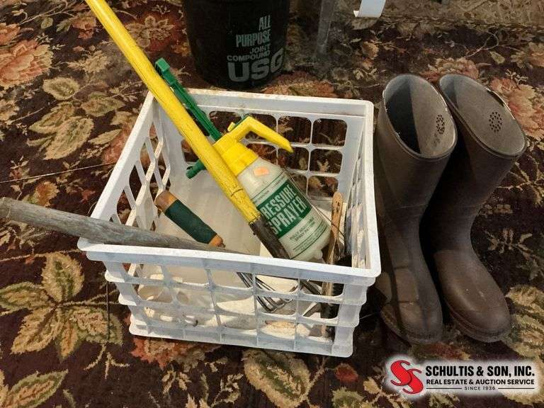 A plastic crate with assorted garden tools and a pair of rubber boots. Contains a sprayer, pruning tools, and other accessories. Items show wear consistent with prior use.