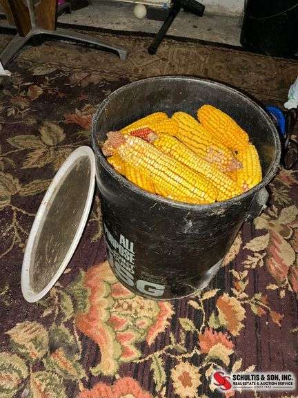 Large black bucket filled with dried yellow corn cobs, accompanied by a detachable lid. Suitable for decorative or agricultural use.