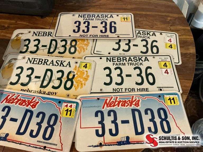 Nebraska license plates, including farm truck and standard plates with consecutive or similar numbers, varying years and stickers.