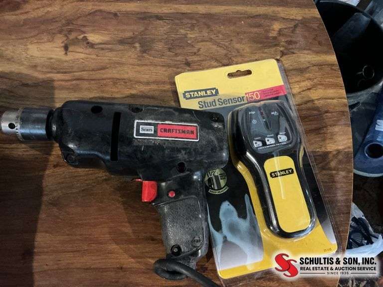 Includes a Craftsman electric drill (corded) with visible wear and a Stanley Stud Sensor 150 in original packaging. Wear noted on the drill; the stud finder appears unused in sealed condition. Functionality untested.