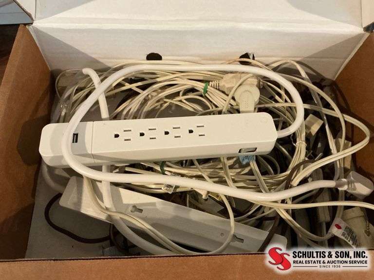Electrical cords, power strips with USB ports, and extension cords. Varied cord lengths and designs. Sold as is.