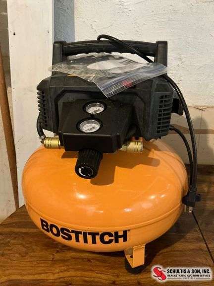Bostitch 6-gallon pancake air compressor with dual pressure gauges, black control panel, and orange tank. Designed for 150 max PSI. Includes an attached handle and power cord. Condition shows light wear from prior use.