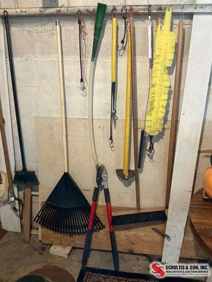 Lawn tools including rakes, brooms, clippers, and dusters. Items show wear from prior use.