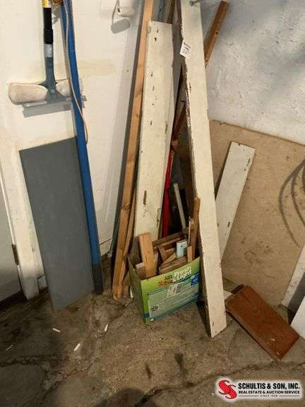 Wood pieces in various sizes including planks, boards, and smaller cuts. Includes a box with additional mixed wood components. Suitable for crafting, repair, or projects.