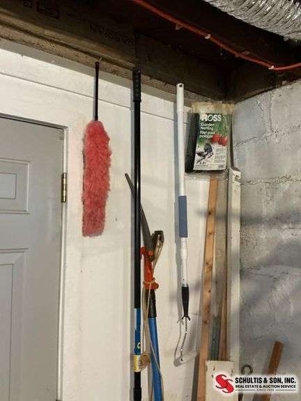 Pruning saw on pole, pink duster, adjustable rod, and 7'x21' garden netting in packaged condition.