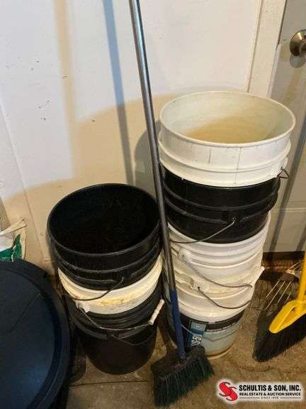 Plastic buckets, including black and white variations, with a broom included. Buckets show wear from previous use.