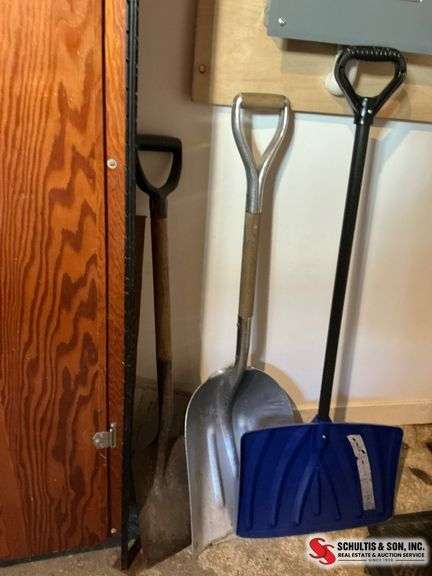 Includes one steel digging shovel with wooden handle, one aluminum scoop shovel with metal handle, and one plastic snow shovel with metal handle. Minor wear visible.