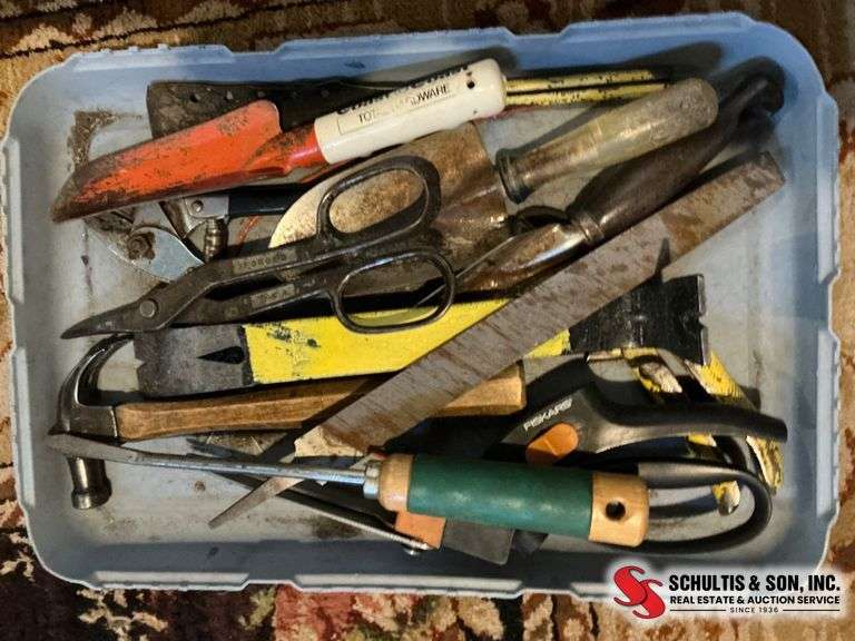 Variety of hand tools including hammers, shears, garden tools, and a file, stored in a plastic tray. Moderate wear from use.