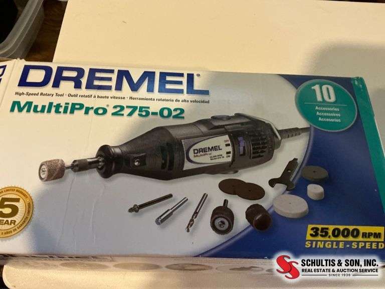Dremel MultiPro 275-02 single-speed rotary tool with original packaging, manuals, and 10 accessories. 35,000 RPM. Tested use or condition unknown.