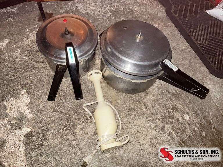 Two metal pressure cookers with lids and a handheld electric blender. Exhibits signs of prior use.