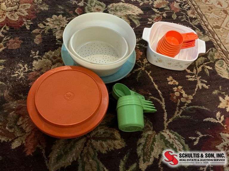 Includes measuring cups, plastic bowls with lids, strainer bowl, and a patterned ceramic dish. Varied colors and uses.