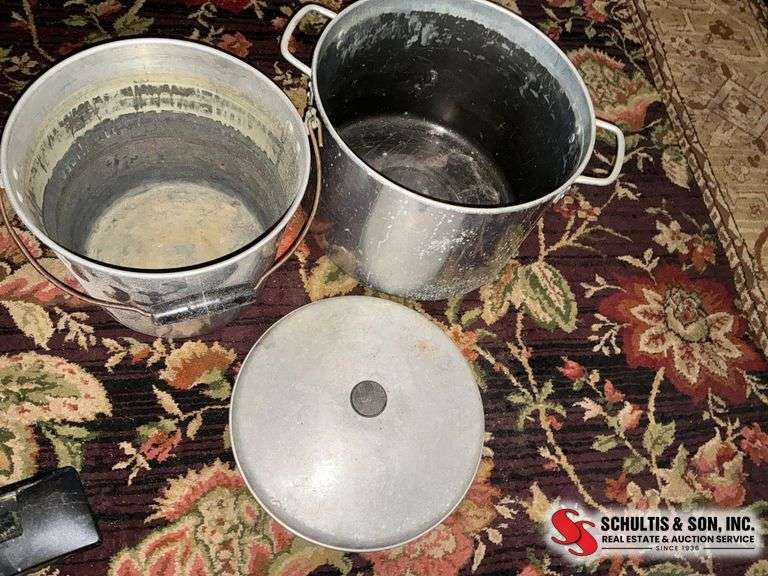 Two aluminum pots with handles and one metal bucket with a wooden handle. Notable wear present. Ideal for utilitarian or decorative purposes.