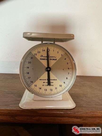 American Family Scale for up to 24 pounds. Cream-painted metal construction with enclosed rear mechanism. Shows wear consistent with use.