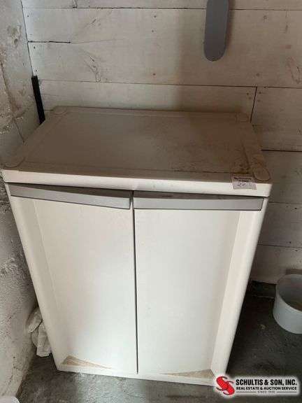 Two-door plastic cabinet with three fixed interior shelves. Some surface wear and markings evident. Functional storage piece.