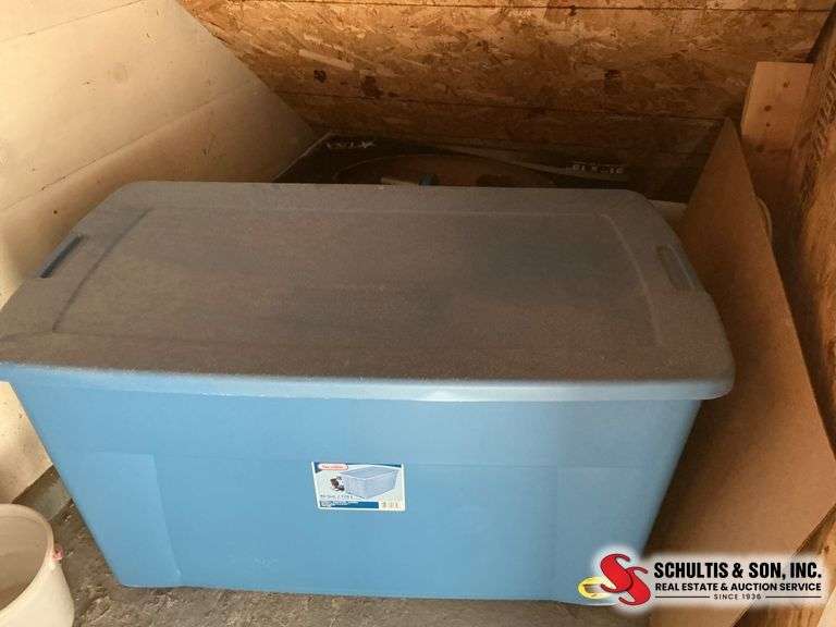 Sterilite 45-gallon blue plastic storage tote with lid. 170L capacity. Made from durable plastic with reinforced corners. Minor surface wear present.