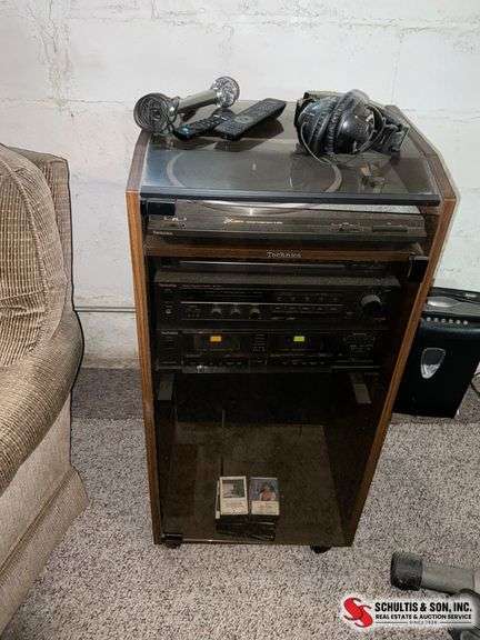 Technics stereo system with turntable, tape deck, AM/FM tuner, and amplifier in a cabinet. Includes headphones, microphone, Philips remote, and assorted tape cassettes. Signs of use on all components. Refer to photos for details.