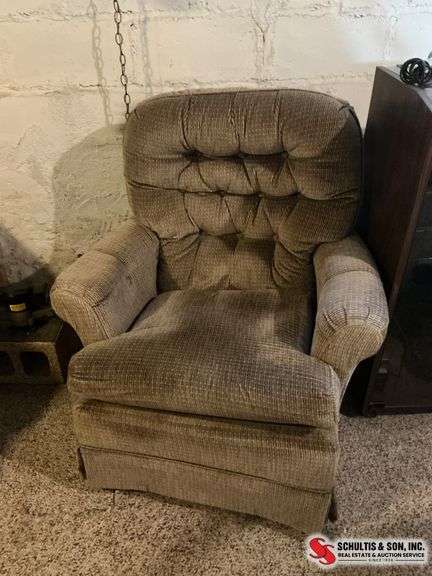 Armchair with a tufted backrest and brown ribbed fabric upholstery. Features rounded arms and a cushioned seat. Shows wear consistent with age and use.
