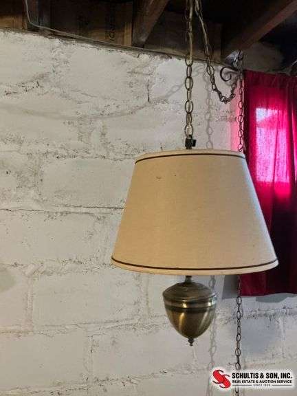 Hanging pendant light with chain links. Features a beige tapered shade and brass-finished metal base. Wiring condition unknown.