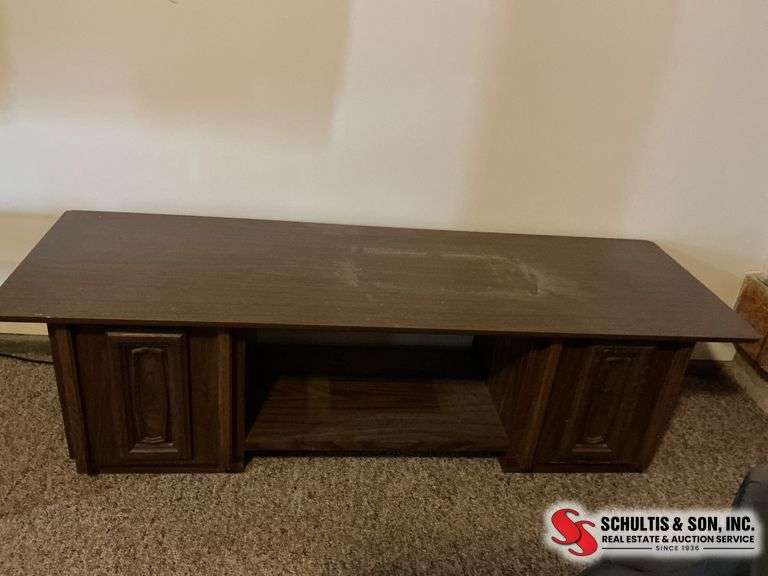 Wood veneer table with two side cabinets and a central open storage space. Features rectangular design and a flat top with visible wear. Approximate dimensions unavailable.
