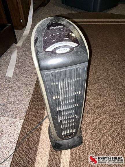 Tower heater with oscillation function and control panel on top. Features heat venting and airflow slots throughout. Power cord included.