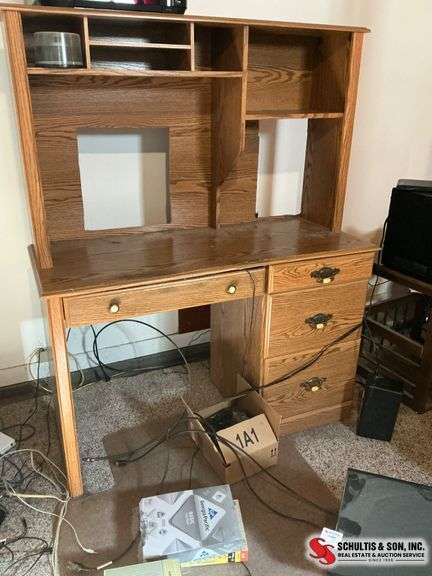 Oak desk featuring a built-in hutch with multiple shelves and compartments. Includes three drawers with brass-tone pulls. Shows visible wear and is sold as-is.