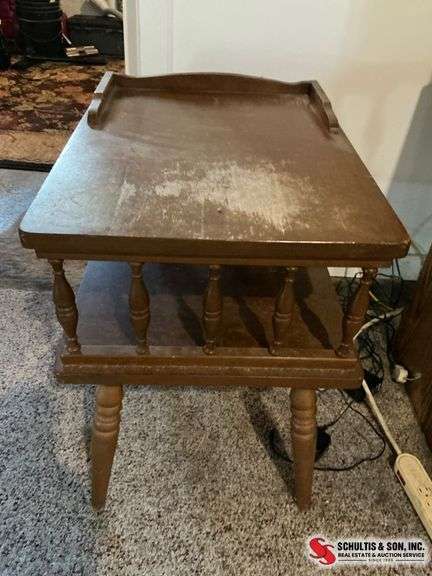 Two-tier wooden side table featuring turned spindle supports and raised edges on the top surface. Visible surface wear present. Approximate dimensions unavailable.