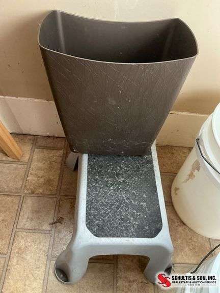 Two white plastic 5-gallon Hy-Gard utility buckets and a gray plastic step stool with textured surface. Items show signs of prior use.