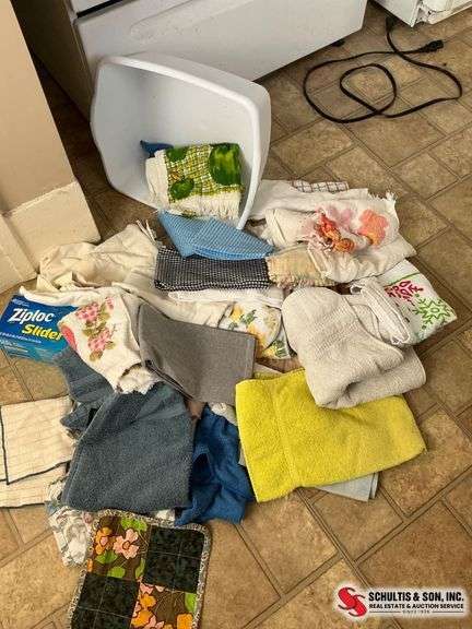 Fabric linens including towels, cloths, and napkins with various patterns and colors. Condition varies.