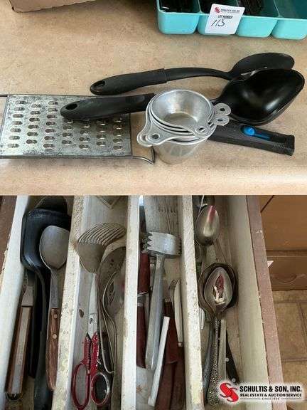 Kitchen utensils including ladles, graters, spoons, scissors, and a meat tenderizer stored in drawer organizers. Condition shows evidence of use.