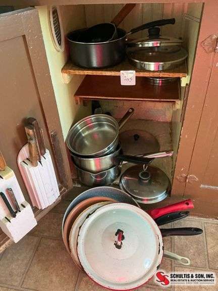 Pans and pots, including stainless steel and non-stick options. Some pieces marked Wear-Ever. Includes lids.