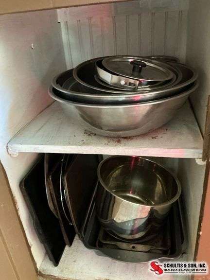 Kitchen bakeware including mixing bowls, baking pans, and trays. Items show signs of prior use with wear marks and residue.