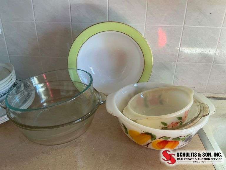 Glass and milk glass Pyrex bowls, one with fruit motifs, and white bowl with green rim. Marked 'Made in USA.'