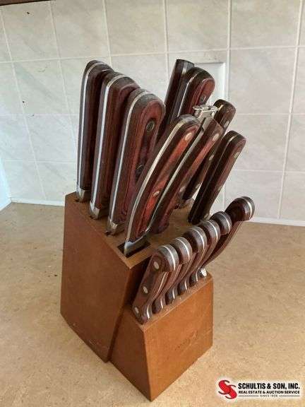 Knife set with wood handles in a wooden block by Emojoy. Includes serrated and straight blades. Light wear from use.
