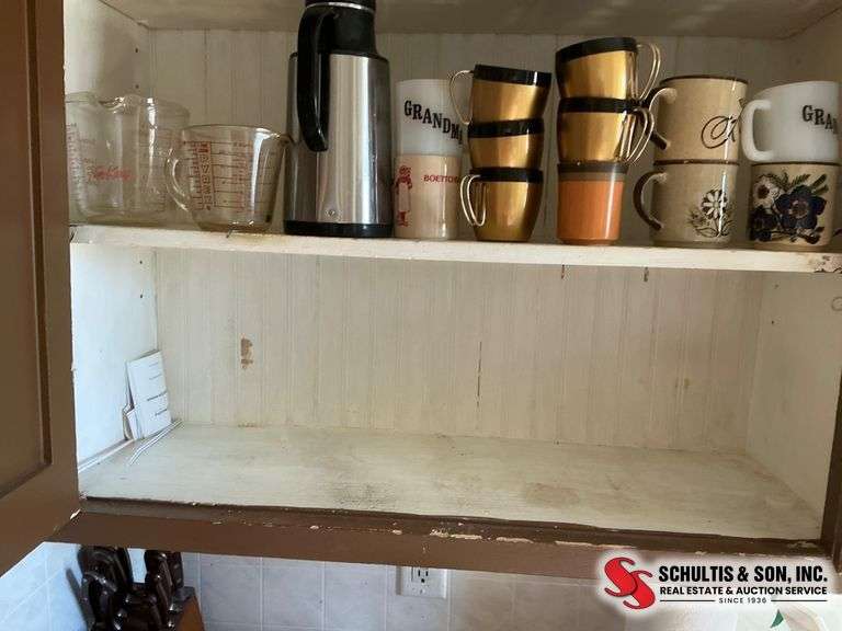 Pyrex and Fire-King glass measuring cups, a stainless steel thermal carafe, gold-tone mugs, and printed ceramic mugs. All items show wear consistent with age and use.