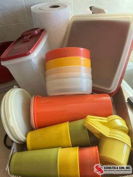 Plastic kitchenware including tumblers, storage containers, measuring cups, and lids in various colors and sizes. Items show wear consistent with use.