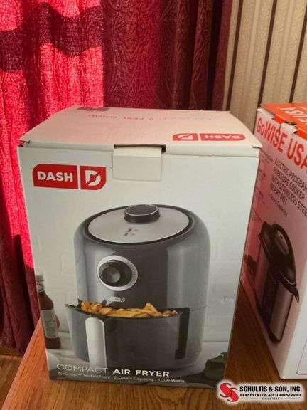 Dash compact air fryer with a sleek metallic finish and adjustable temperature dial for frying, baking, roasting, and reheating. Boxed with detailed instructions and capacity information. Condition details available upon inquiry.