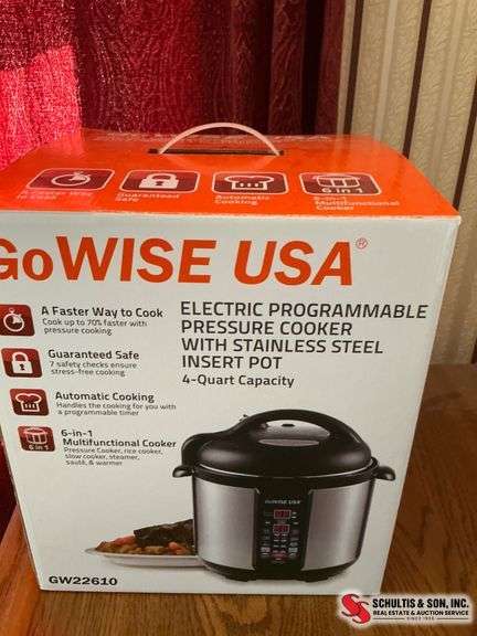 GoWISE USA electric programmable pressure cooker with a stainless steel insert pot. 4-quart capacity. Model GW22610. Features automatic cooking modes and safety mechanisms. Original packaging with product details visible.