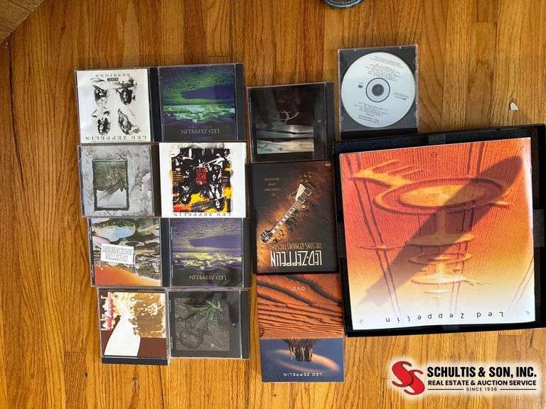 Music collection featuring Led Zeppelin albums and DVDs, including box sets, CDs, and a documentary DVD.