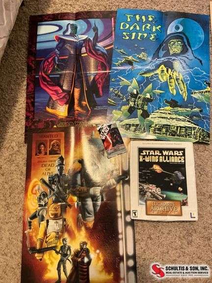 Star Wars memorabilia including three posters (The Dark Side, Bounty Hunters) and X-Wing Alliance PC game (LucasArts Archive Series).